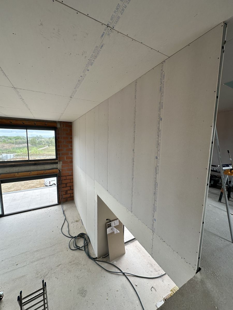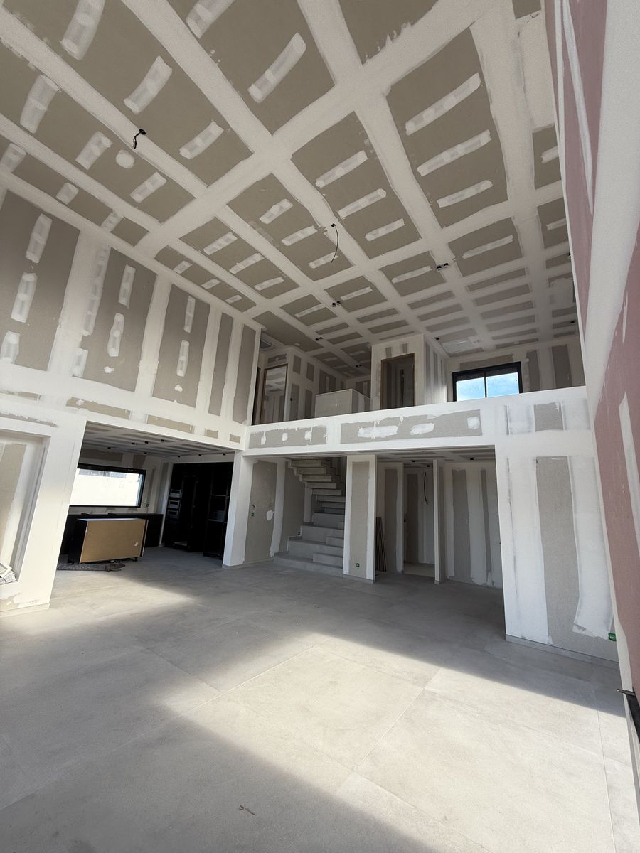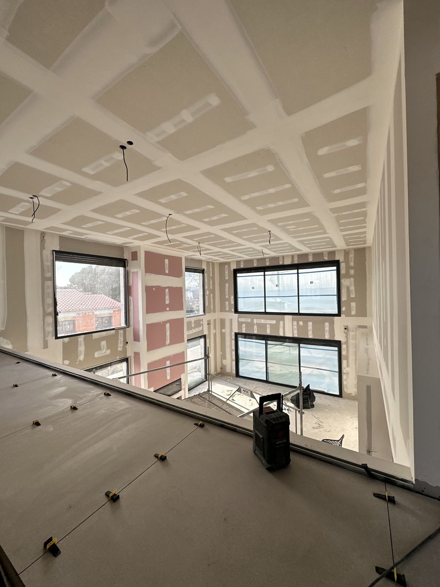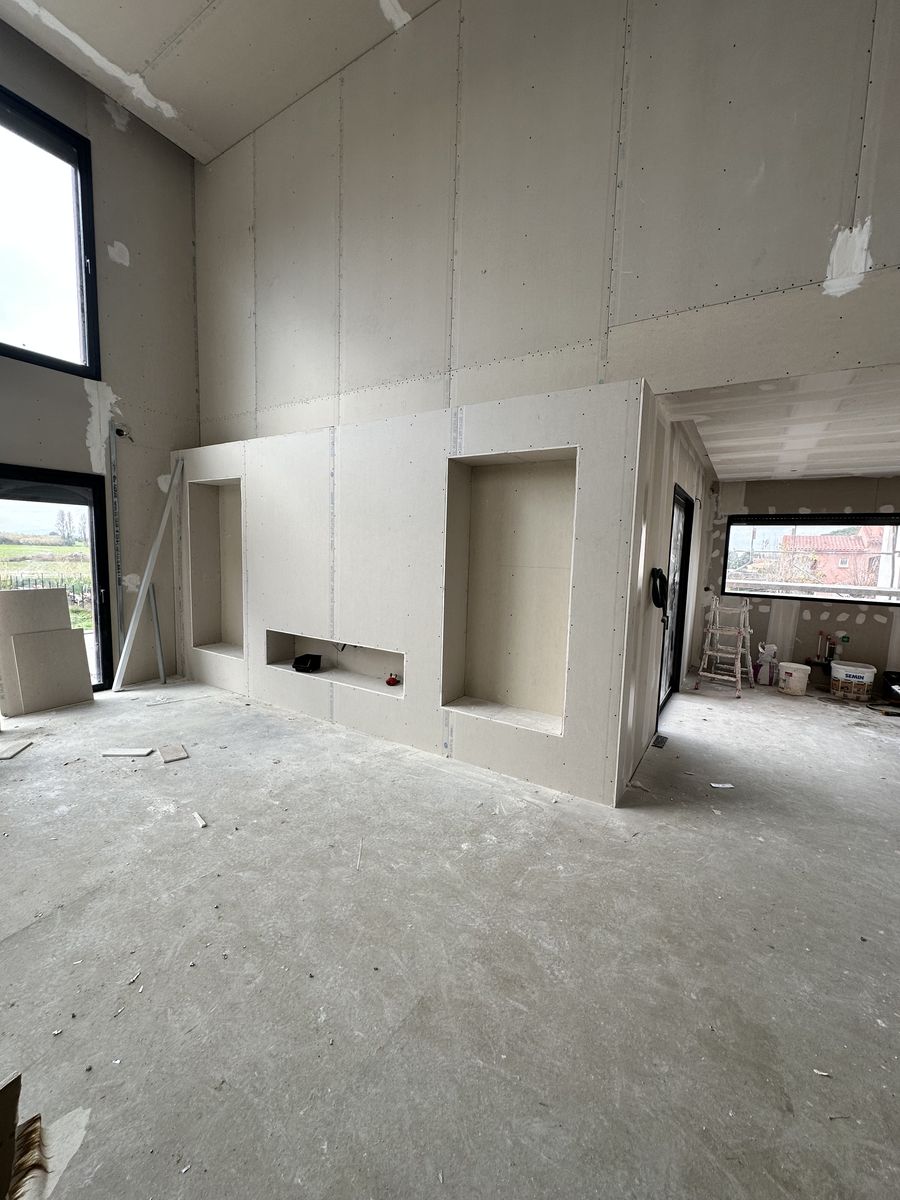Le chantier inclut plusieurs éléments décoratifs en placo ainsi que des encoches intégrées au plafond pour l’installation de tringles à rideaux.