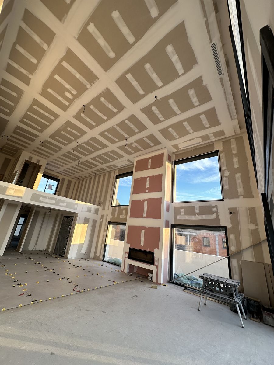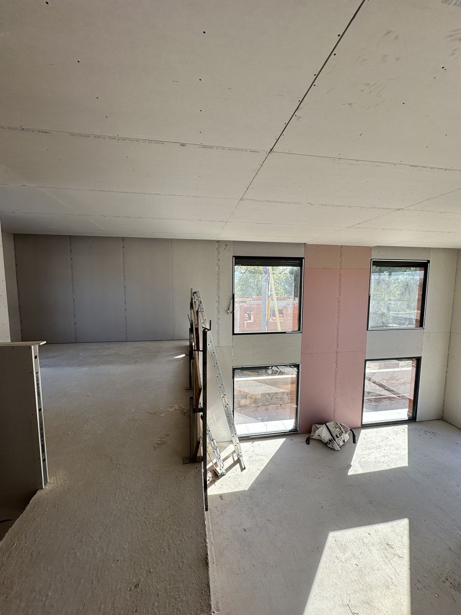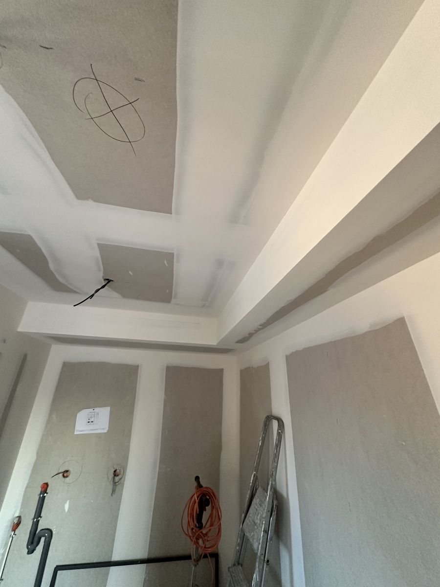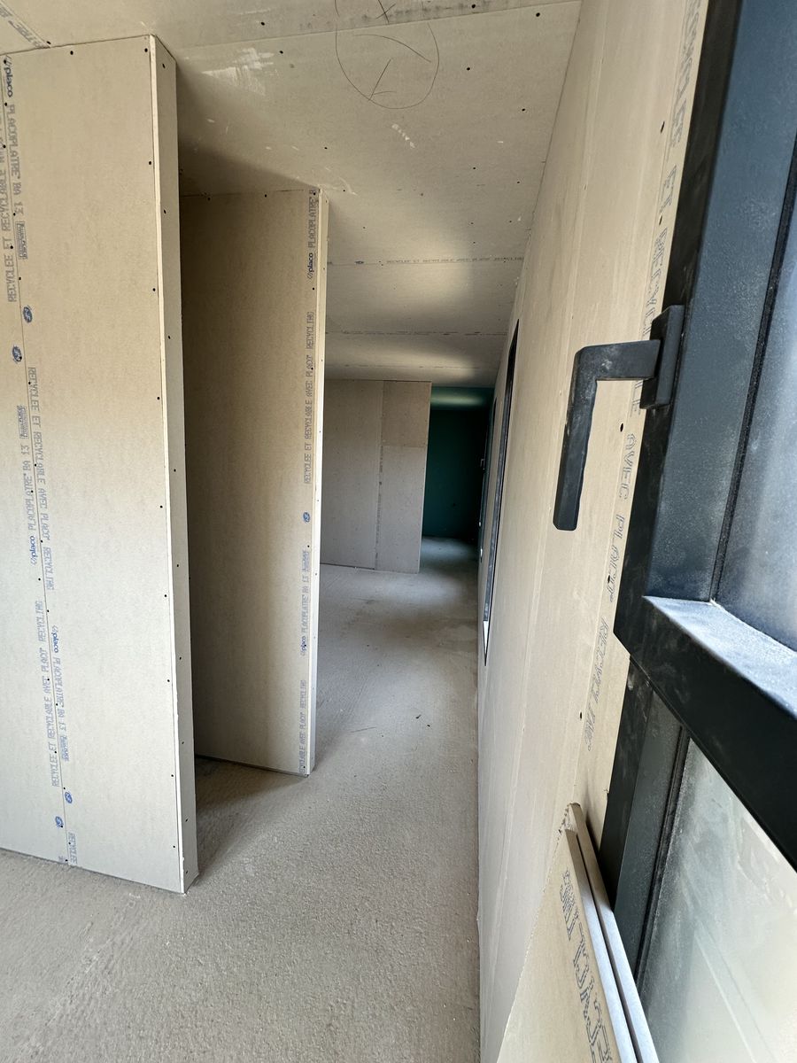 Le chantier inclut plusieurs éléments décoratifs en placo ainsi que des encoches intégrées au plafond pour l’installation de tringles à rideaux.
