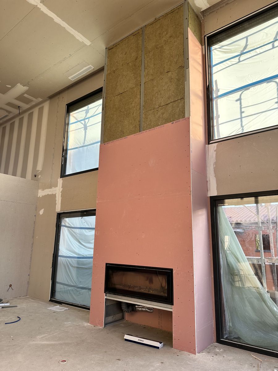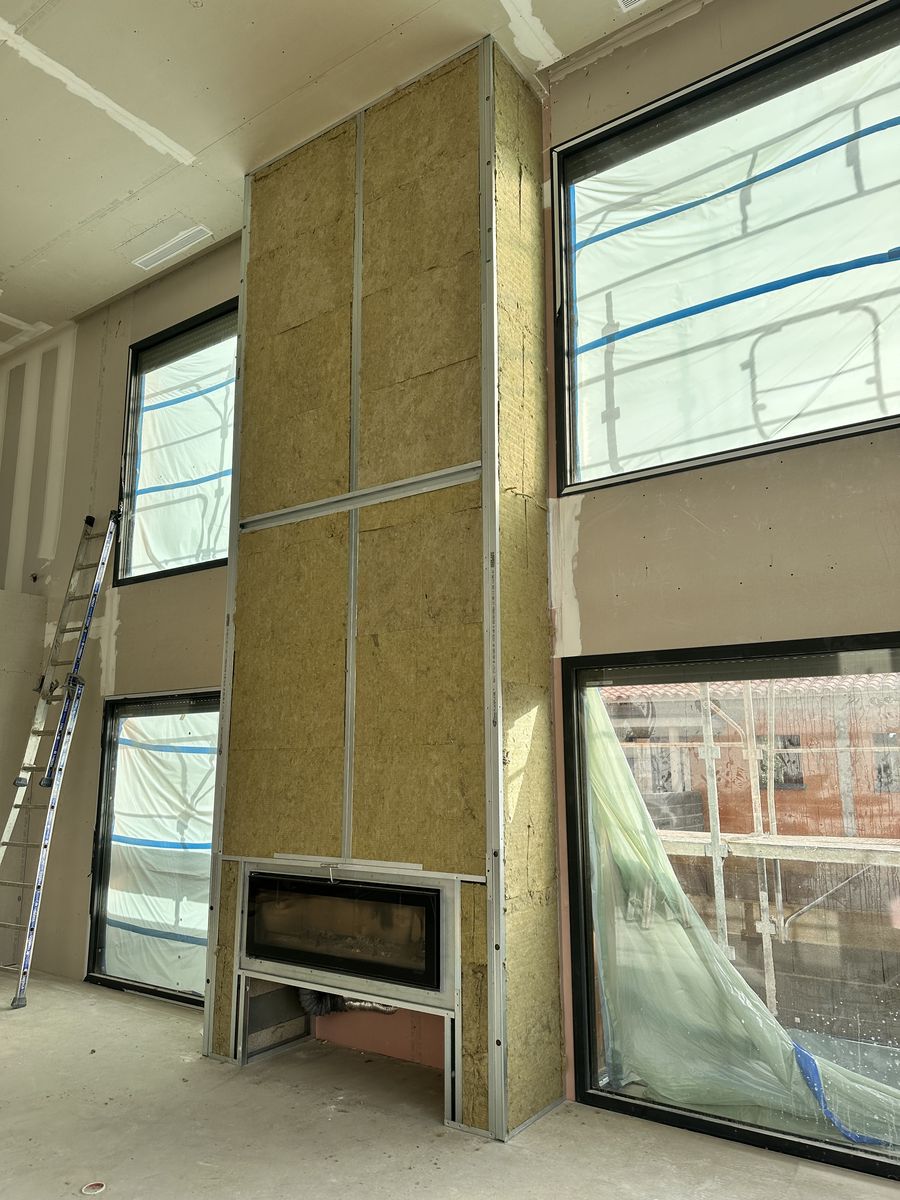 Un habillage de cheminée complet avec laine de roche a également été réalisé, alliant sécurité et esthétique.