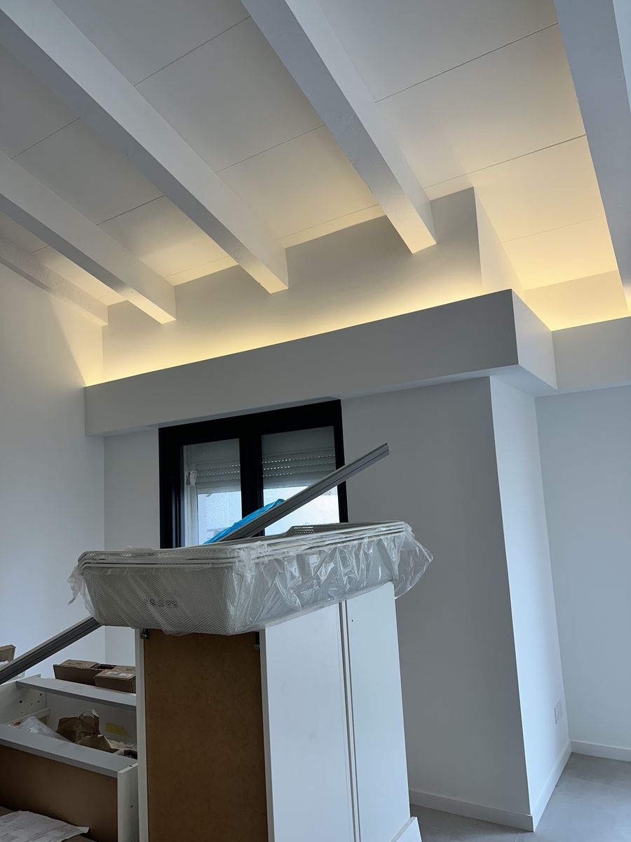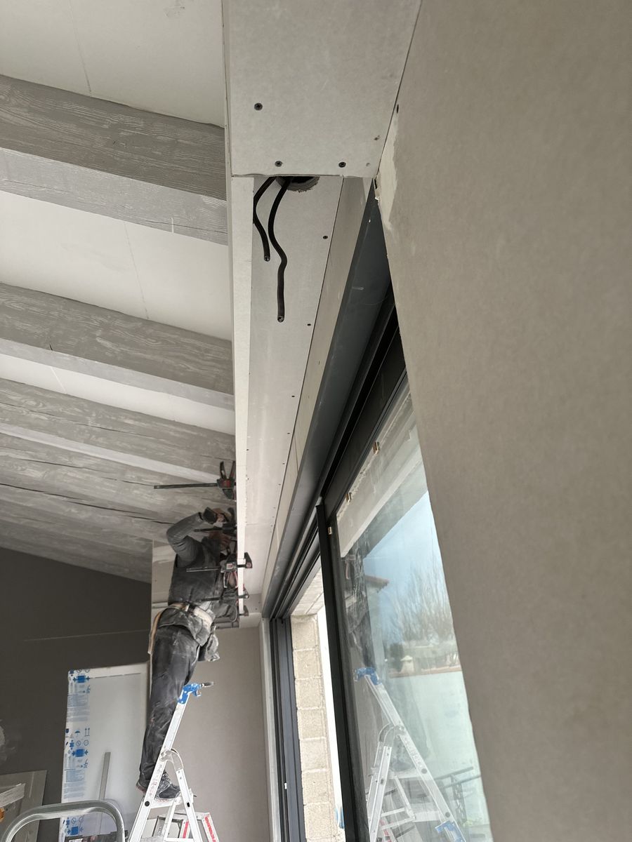 Création d’un coffre linéaire en plaques de plâtre, conçu sur mesure pour intégrer un éclairage discret et des stores enroulables.