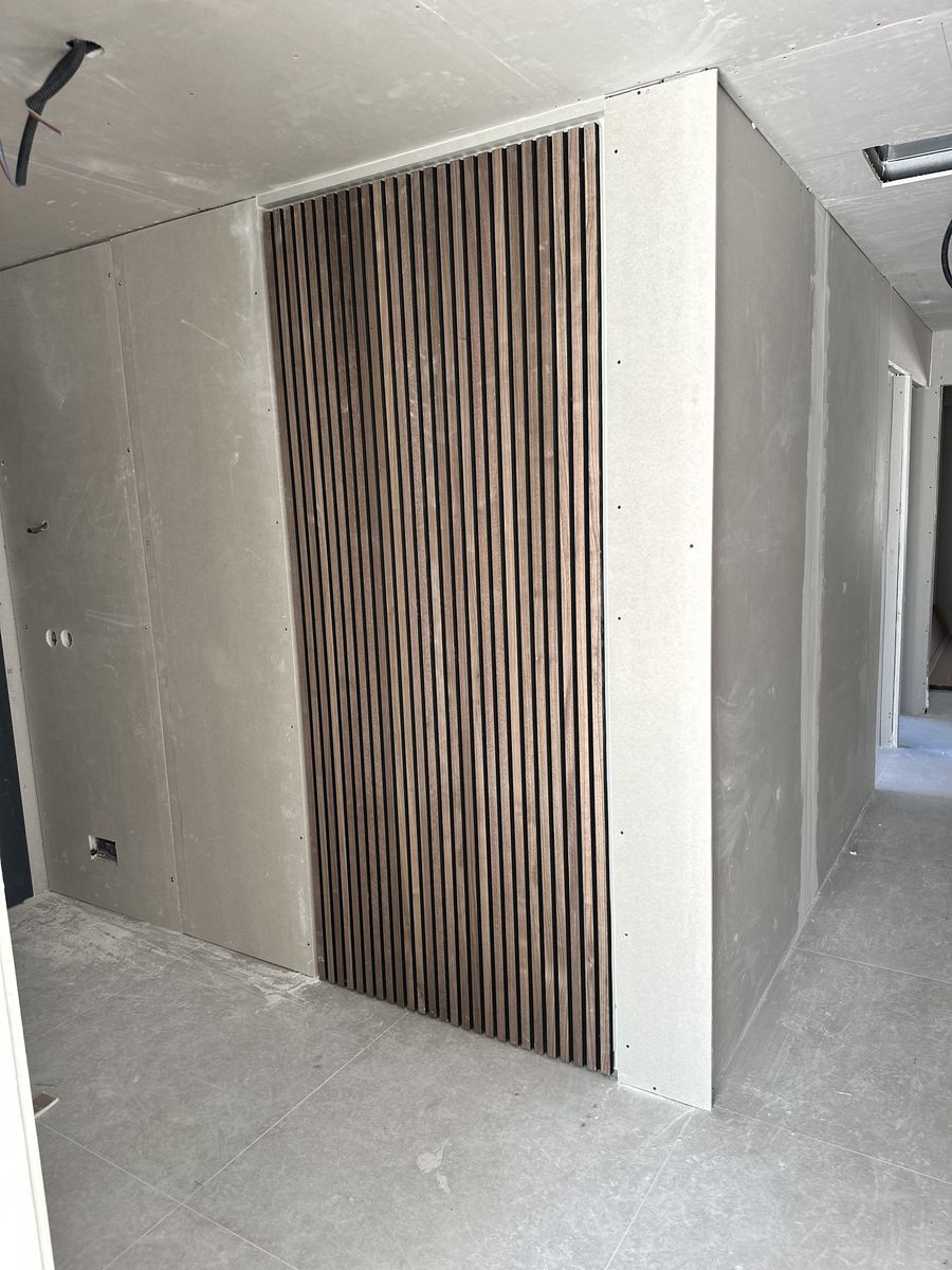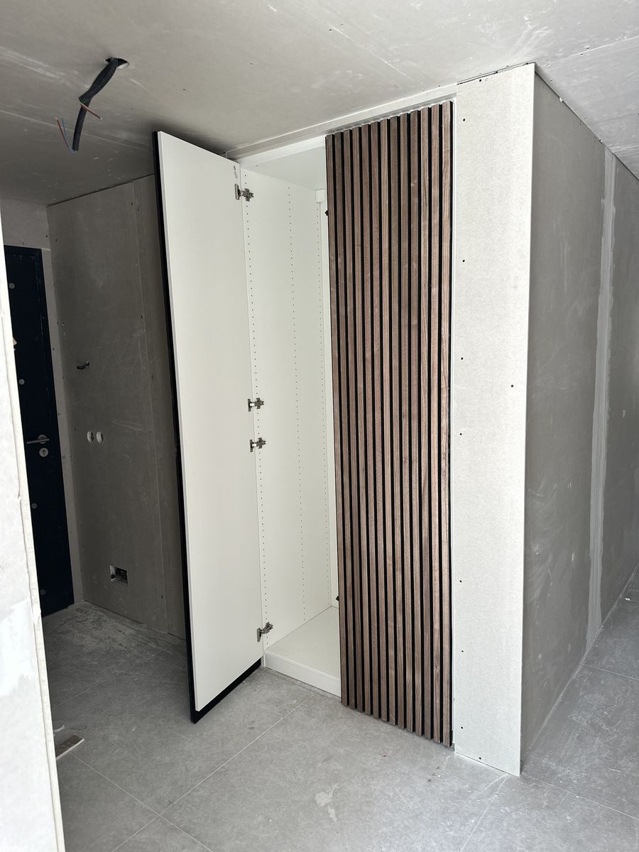 Conception d’une armoire encastrée, mise en valeur par un habillage en parement claire-voie, combinant esthétisme et praticité.